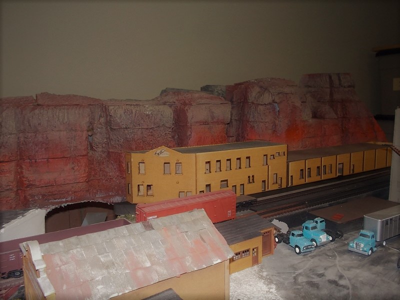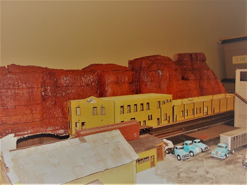 The building is basically complete with details yet to be added ......doors , windows etc . I'm also working on a couple of 5 foot sections of blue foam " mountains " for my backdrop . One of the 5 foot banks is almost complete and in place while the other is almost done . I haven't used this product for mountains before ...usually cushion foam and/or plaster of paris . The blue foam is the costliest and messiest method by far but so far I like the results .