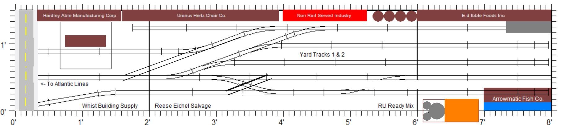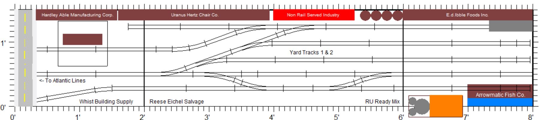 The switchback in the upper right of the plan is long enough to accommodate a car in E. D. Ibble Foods and a small train of 2 cars and a locomotive to serve the manufacturing plant and chair company. I designed the layout so that at maximum, one car would be pulled and one car would be dropped at each spur. I plan to run 3-5 cars per operating session by rolling a dice and using a shuffled deck of index cards for each industry.
