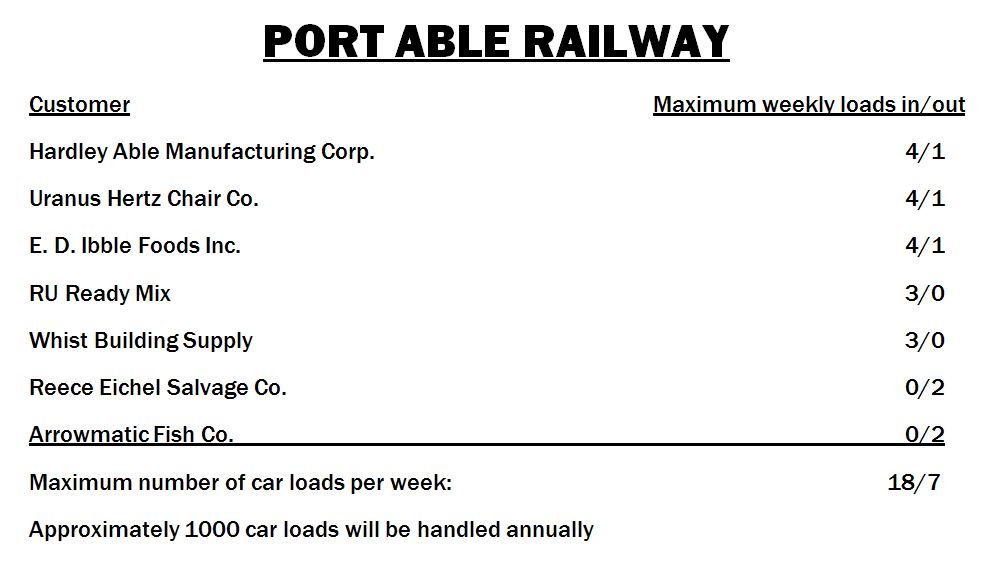 The backstory is that once the Port Able Shipbuilding Company shut down in 1978, the city of Port Able bought the property and repurposed it into an industrial park. The Port Able Railway was named as the designated operator to provide rail service to the former shipyard. The Atlantic Lines bring in cars from the left side of the layout and drops them off into either yard track 1 or 2.