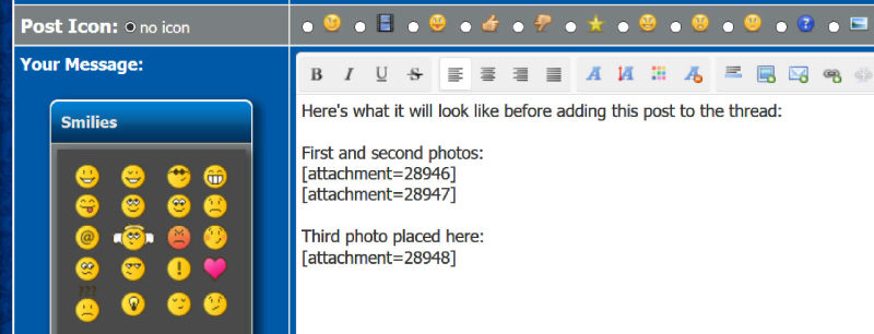 It takes about the same number of steps to add a photo to your posts as it did on our old phpBB forum. As with the old forum software, you cannot gang upload more than one photo at a time, sorry about that, but we don't write the software so we have to use what we get.