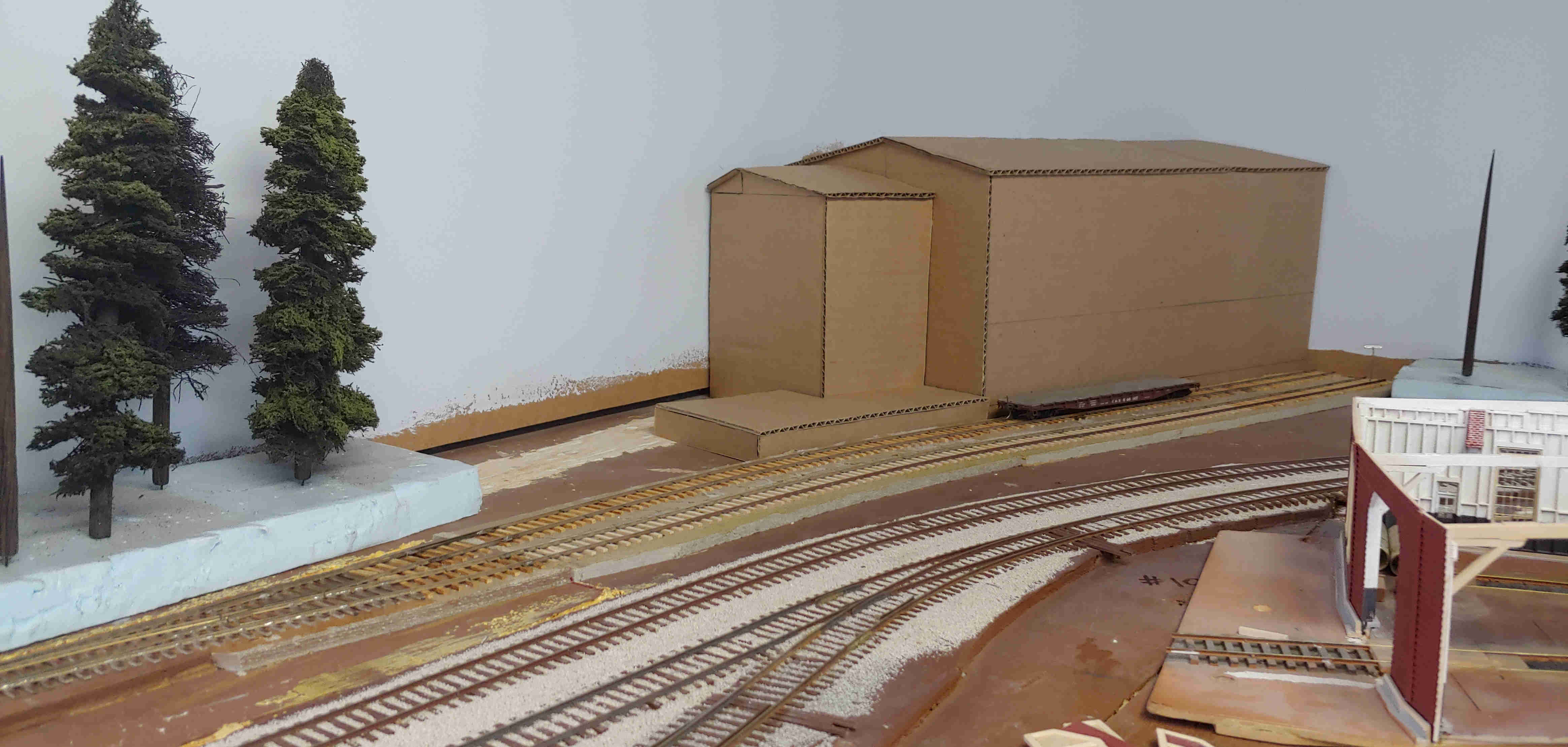 Looking North is a card board mock up of showing the backside of what will be Kootenay Station.  Passenger Ops were never really in the plan however from a scenery and location perspective it makes a lot of sense to include a train station on my layout.  I may yet include a staging cassette at this end where I can build a passenger train and send it across the layout.  Final portion of the backdrop to be completed is next up for this area first.