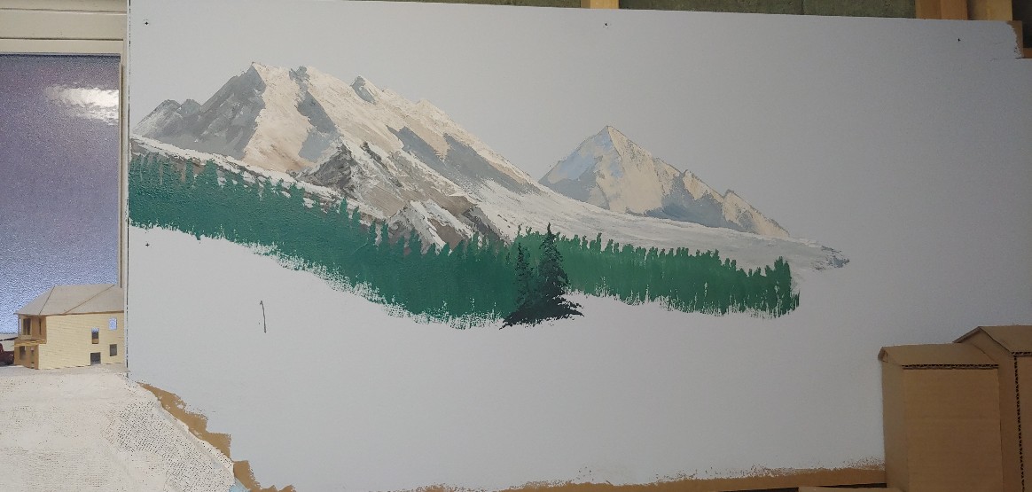 I've been kinda jumping around on projects for the layout and decided the other morning to try my hand at painting some backdrop.  So I just played with some colours and shapes and came up with this.  It's not bad, in fact it looks okay to me.  I'm using dollar store acrylics and the mountains were mostly done with a painting knife.  Disclaimer...I'm not looking for Bob Ross level scenery painting just "good enough" to give the illusion of a world beyond the layout.  That said I think the background trees on the mountain need to be a bit more bluish grey and then gradually darker layers as the foreground comes closer.  That's really my only beef.  I'll probably paint over it and do it again anyways as I really should patch the gap in the hard board on the left first.