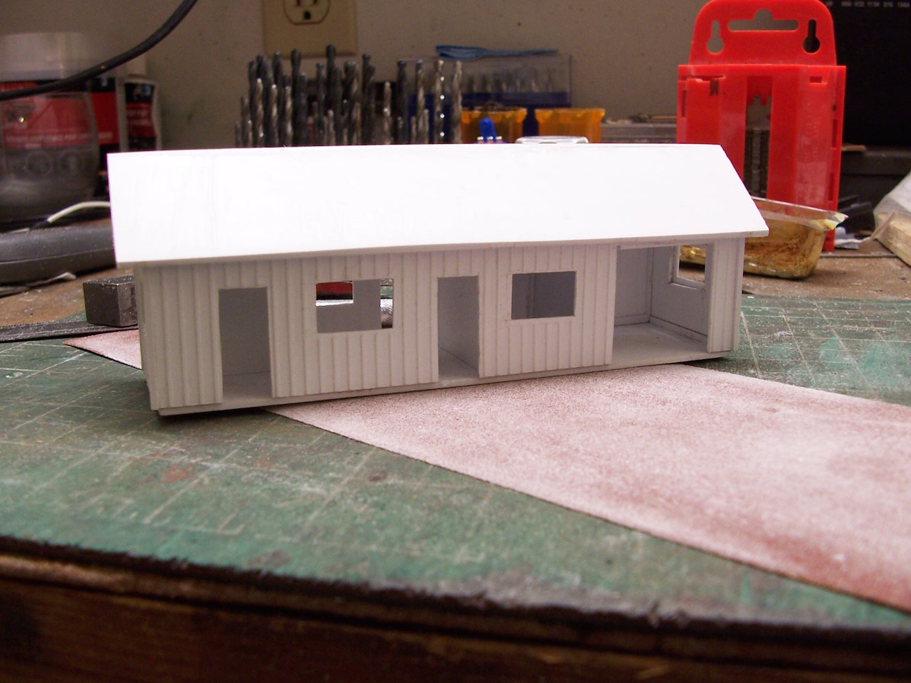 Time now to give the building and its doors and windows a bath, in preparation for paint.