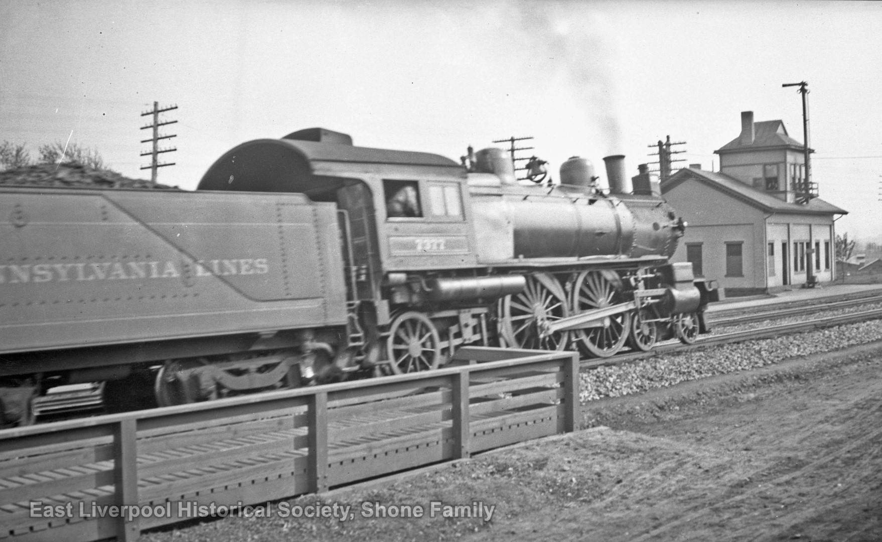Charlie it would be more of a Mistry if you remove the or edit the file name , like the part that says PRR 7377 , as for the date i would have to agree with Wayne late 1800's or early 1900's as the round number plate dates it before 1930 . the loco type might be an E-2 but the number doesn't jive with that class on the 1930's list I have on list it's a E-7 but number could have changed. the carriage in background i would guess its a cab(taxi) that had dropped someone off at the station .