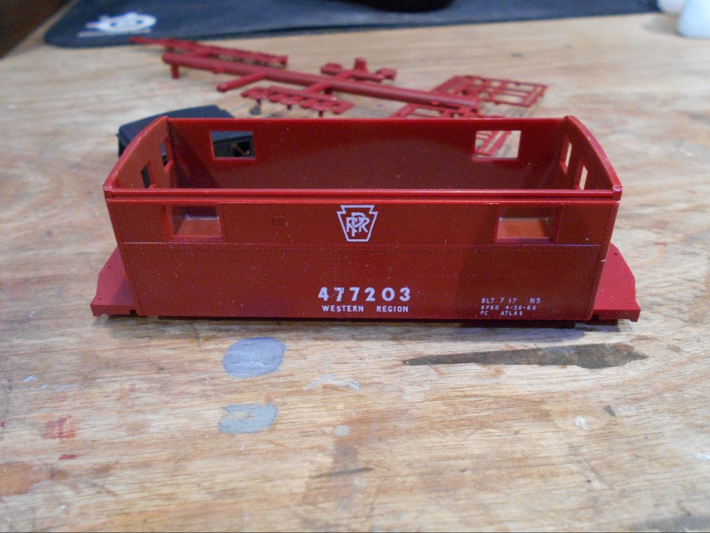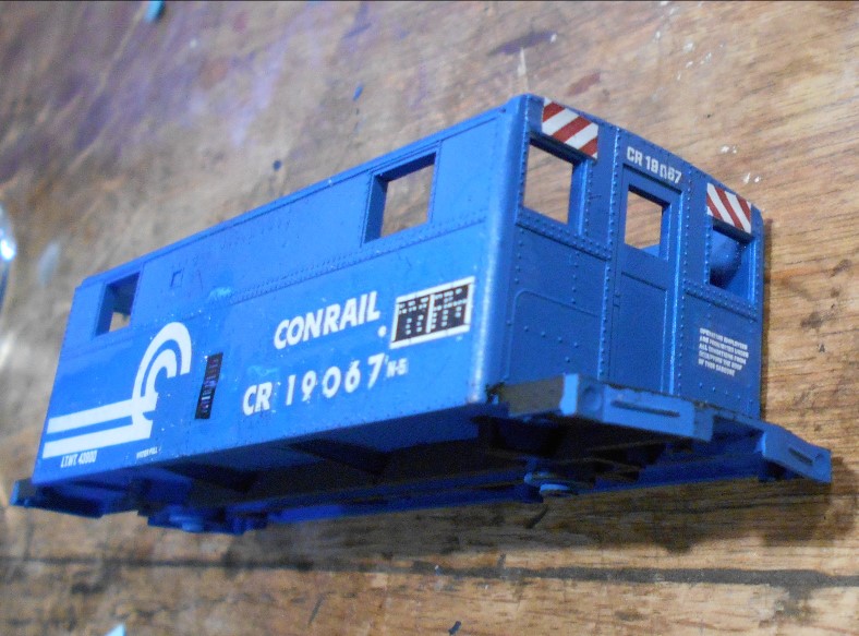 So, here's the before and after of the PRR N5 caboose...   now blue with Conrail decals drying.  Here's the problem with any kit - you see things you'd like to improve - like the non-existent curved grabs on each side.  Found a Walters caboose detail kit... more work!