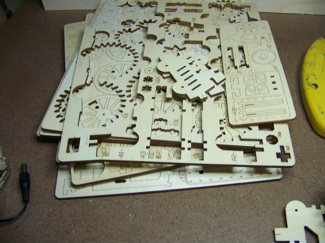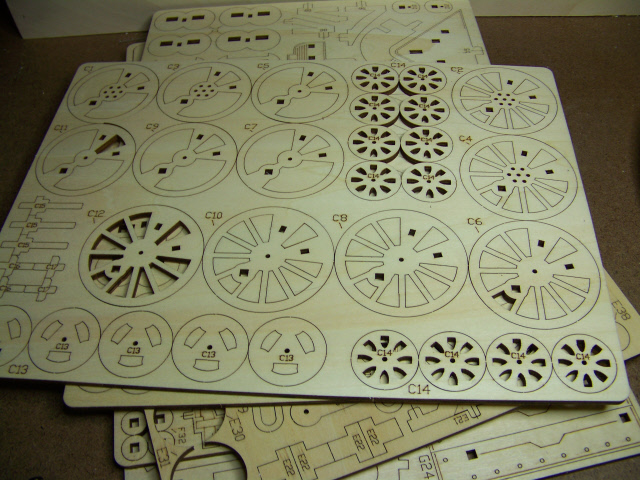 Here are shots of a typical sheet of laser-cut plywood. Some sheets are thicker than others. I found that out when I made the new part.