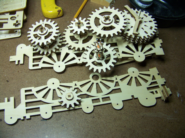 Don't know if anyone here has assembled one of these, but it's a challenge. There is a step-by-step with parts identified, but no tips on how to keep some sub-assemblies together while waiting to use them in a further step. Looking at the Internet, there are many makers, some look like an hour's assembly time for a five-year old, to hours and hours like with the one I have. This one had 290 parts all wood except for the motor spring, some rods and a bell. No glue, just one suggestion, "if part broke, bring glue". Crazy So far I've only broken one part, did not bring glue, just made a new one out of scraps. Applause