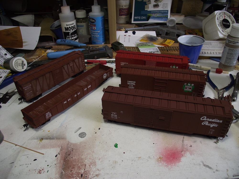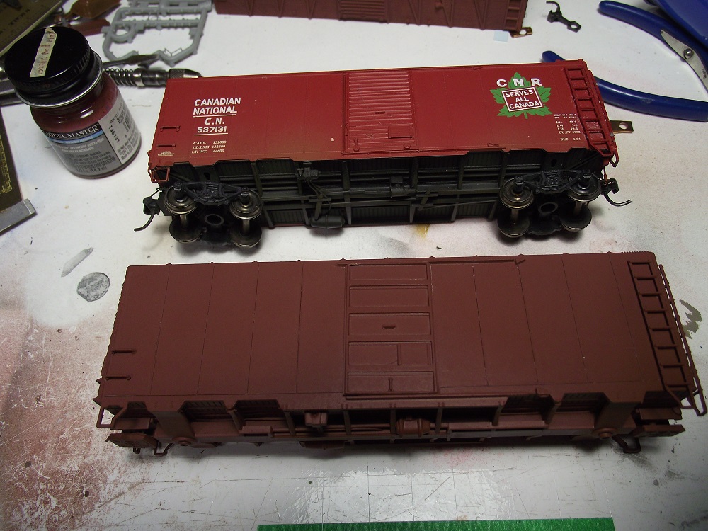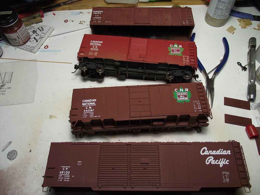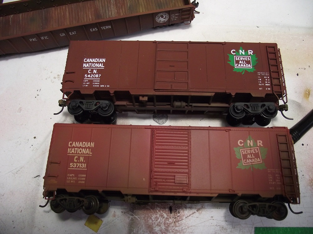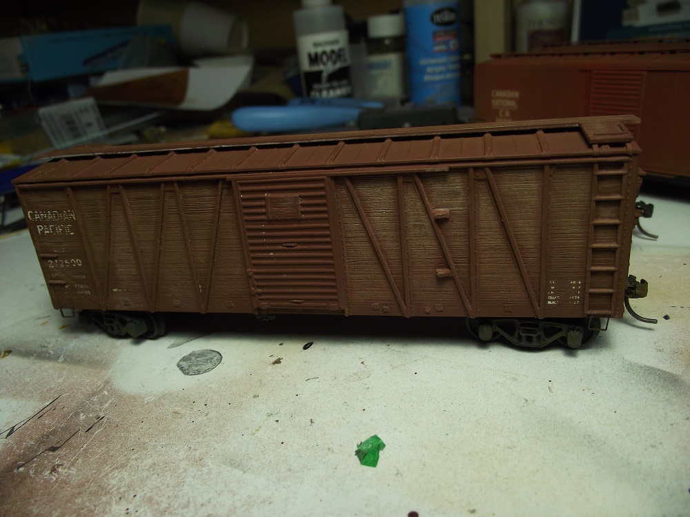The next step is to finish assembled and them weather them. The CPR outside braced car will be fairly heavily weathered due to it's age.  One the other hand, the CP double door will have hardly any weathering at all as the CP 'script' scheme would be brand new on my layout's era.