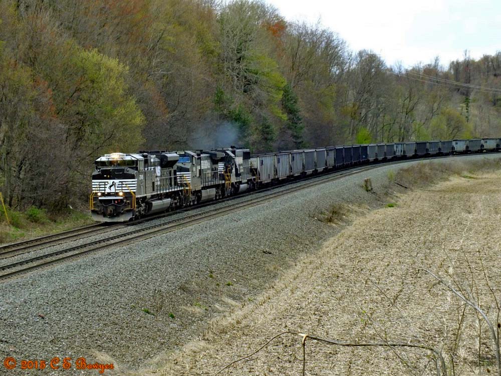 NS 2749 (SD70M2 ) leads an empty coal gon train east at Enon Valley, Pa. May 4, 2014